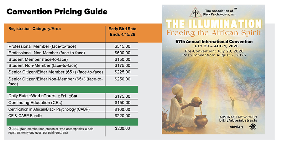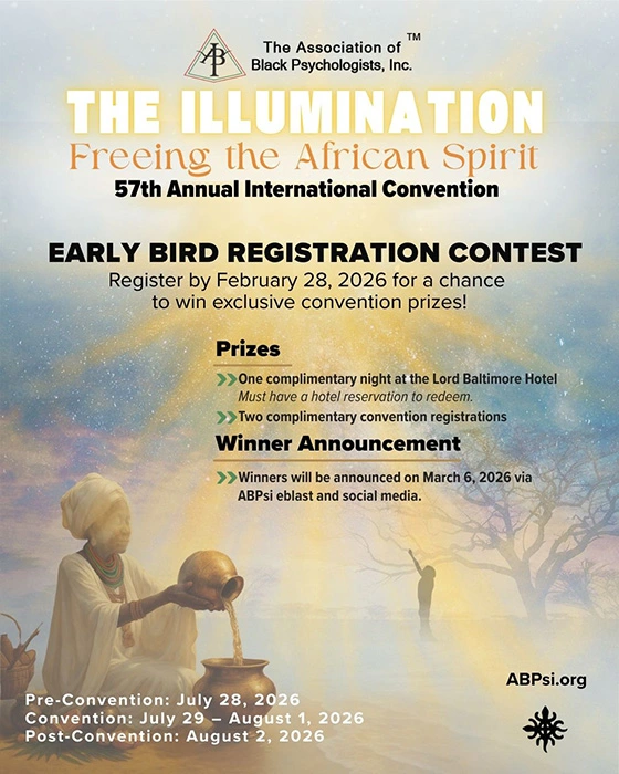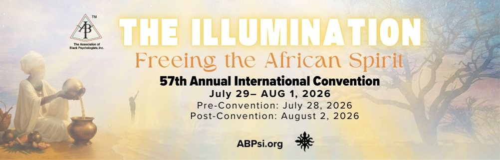 The Association of Black Psychologists, Inc. (ABPsi) is excited to invite you to our 57th Annual International Convention. This year’s theme, “The Illumination: Freeing the African Spirit,” promises to be a transformative experience in African/Black Psychology—providing space for intellectual exchange, cultural celebration, spiritual renewal, and professional development.